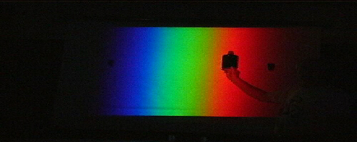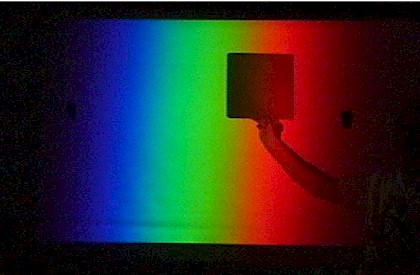 Stand close to the screen and hold a piece of red paper in the white image of the slit on the side of the screen. Ask for student predictions about its appearance in each colour region. Begin in the red region and slowly slide it across the screen. It changes from bright red to black when it enters the green region. It looks black in blue light as well. The dye in the paper absorbs green and blue light so it will only look red (ie reflect red light to their eyes) when there is red light shining on the page.