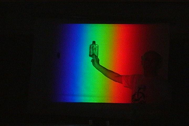 [Note: the bottle must have flat sides. A curved container will act like a lens and focus whatever light gets through the dye into a bright strip on the screen behind. This is an interesting effect, but not useful here.]