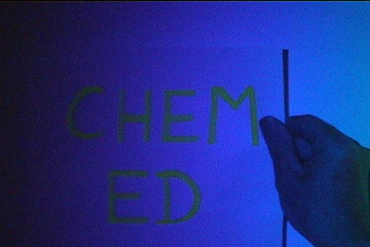 Have a white sheet of paper with large letters written on it with yellow highlighter. (Fresh writing works best.) Start in the red end of the spectrum and slowly slide the paper across the screen. The page will appear blank until it gets into the blue region where the letters will start to fluoresce. The fluorescence will continue as you move beyond the edge of the blue region, showing that the projector bulb is producing invisible UV light. The ink is turning that energy into bright yellow light.