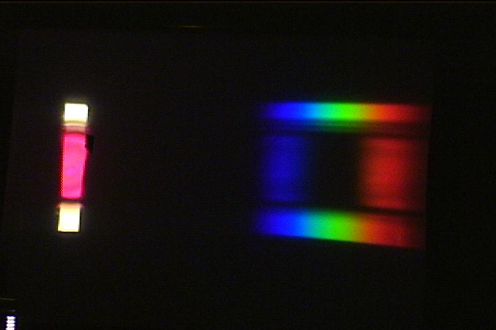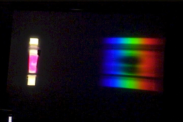 Use the stirring stick to start the solution slowly rotating in the beaker. Then add a drop or two of NaOH solution. As the pink clouds of basic dye drift over the slit (and into the "white" image on the side of the screen), green will dramatically disappear from the spectrum. When the dye has completely turned purple, there will be a dark patch where the green light used to be on the screen.