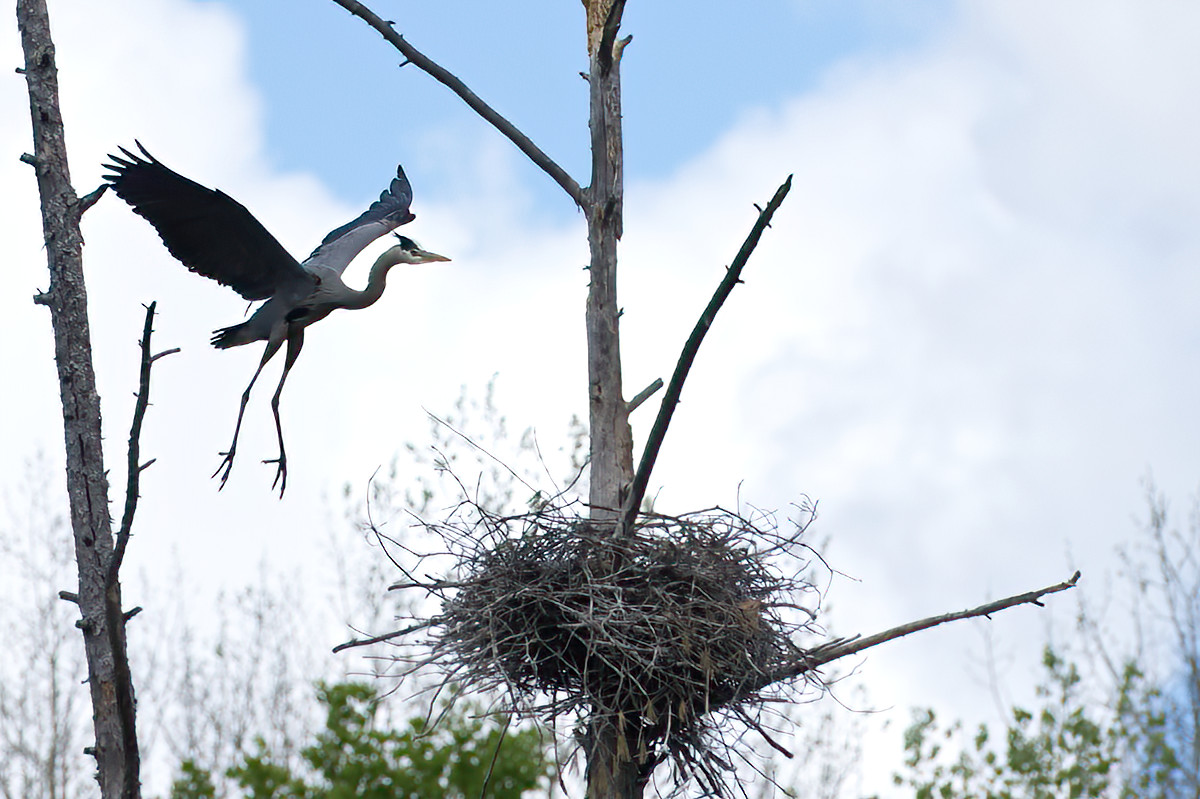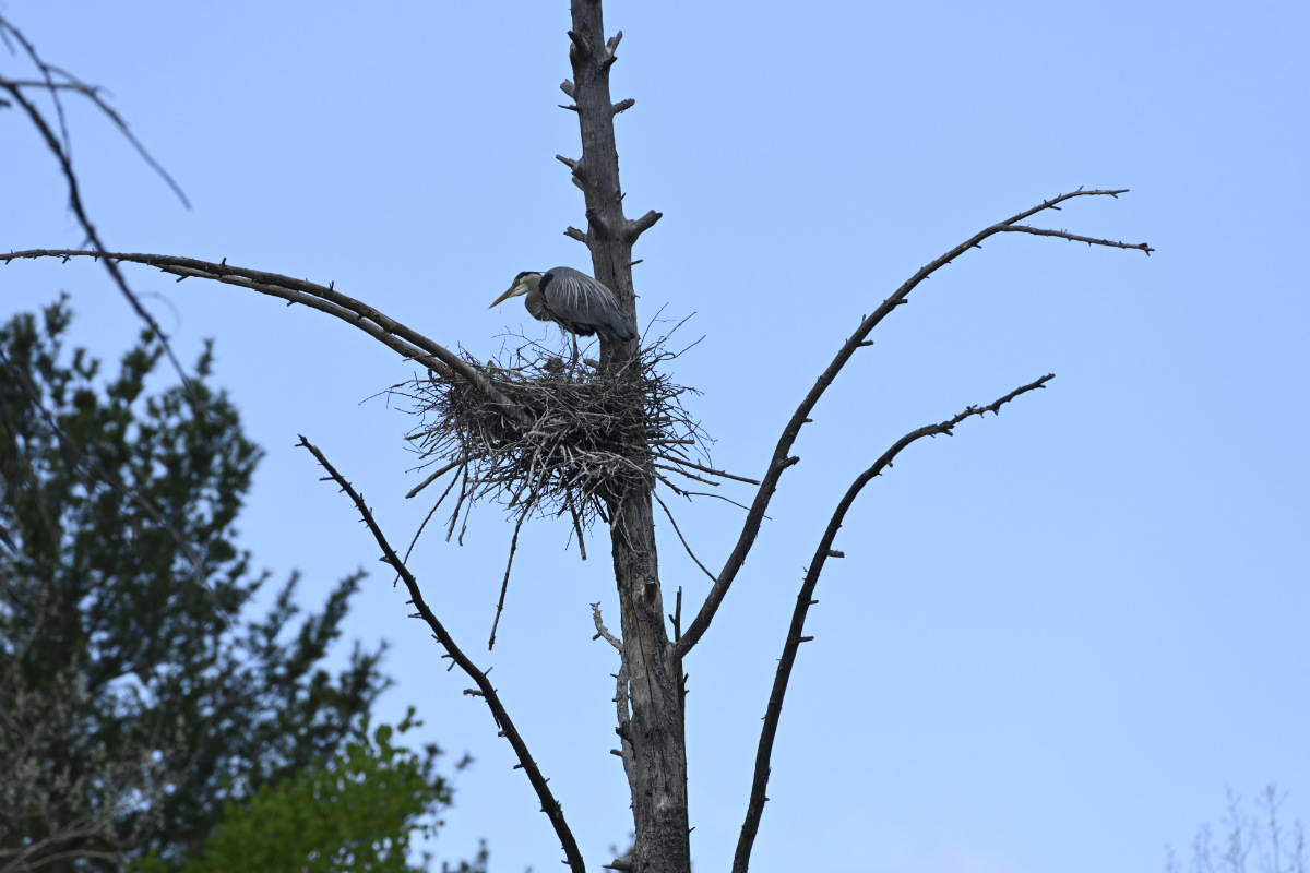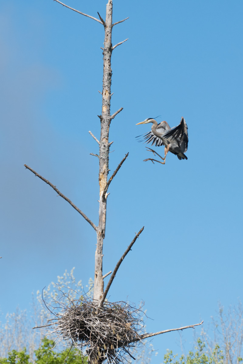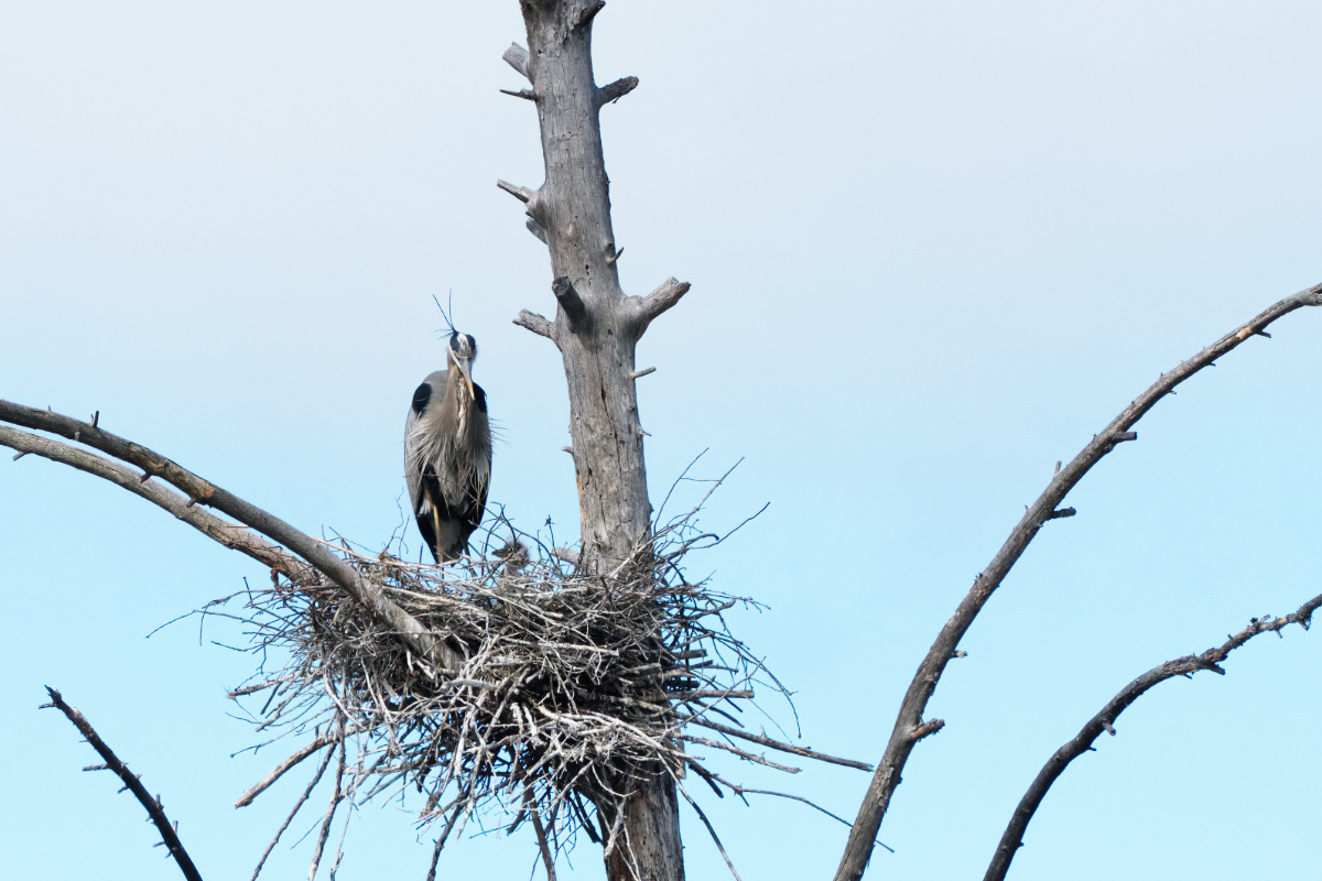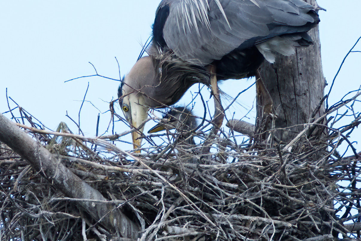 The male purple finch decides to visit the heron nest