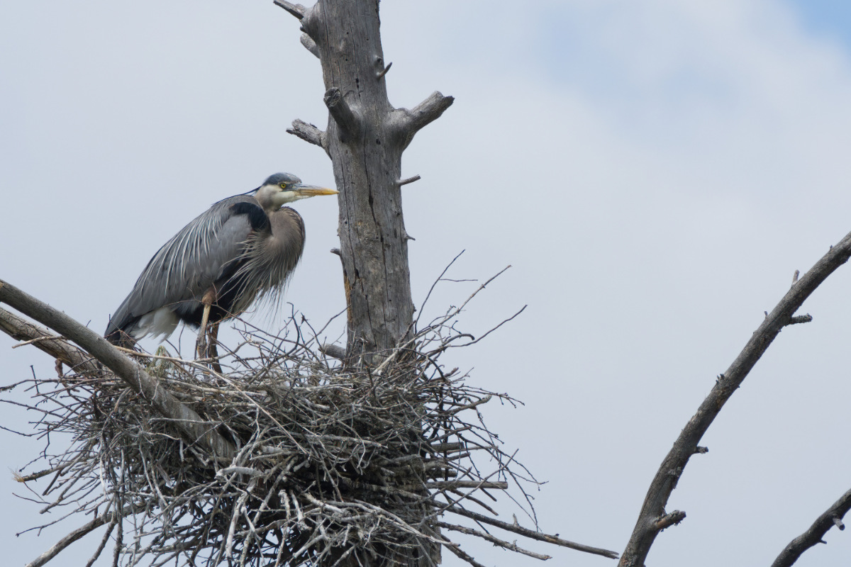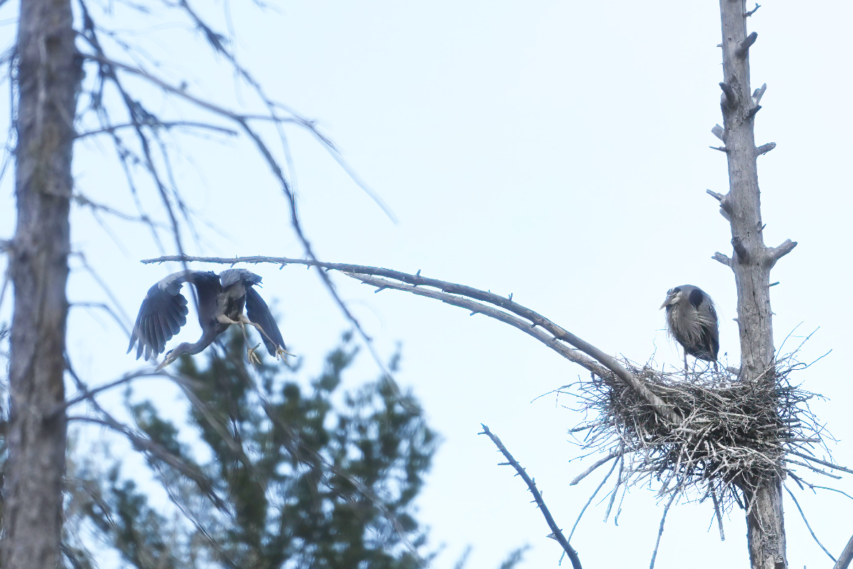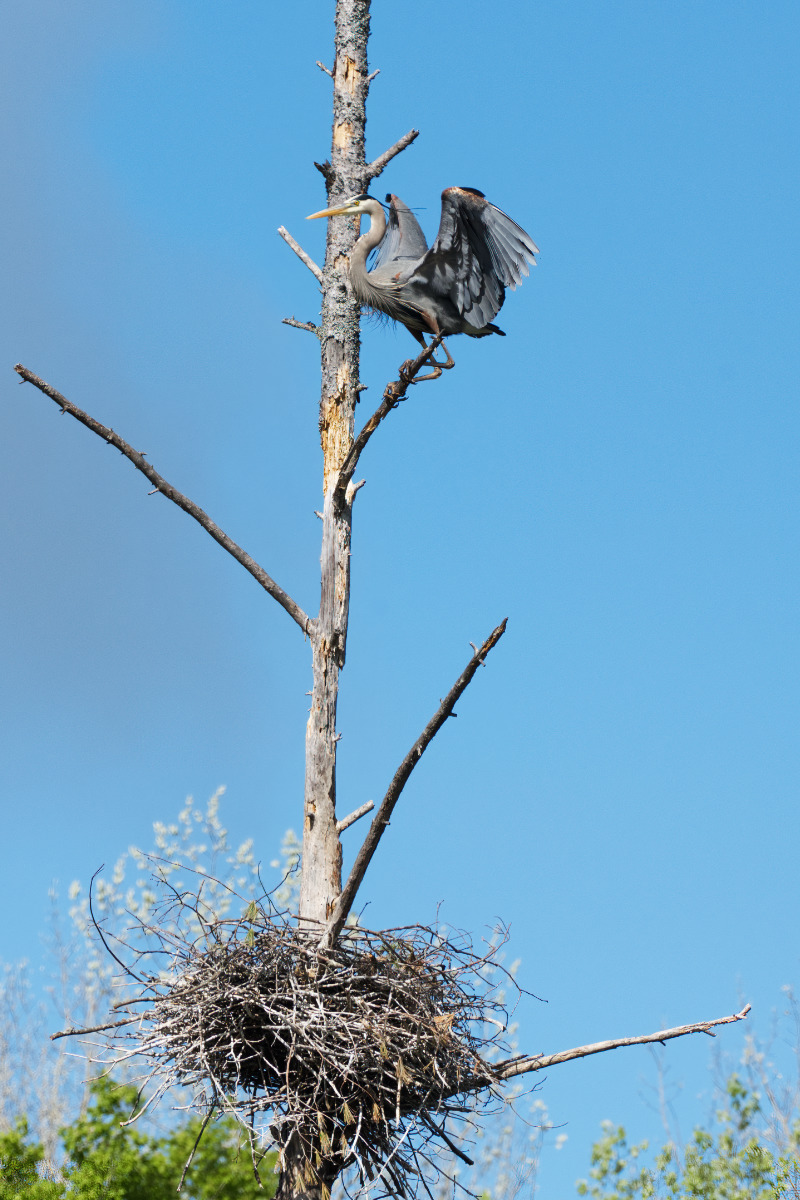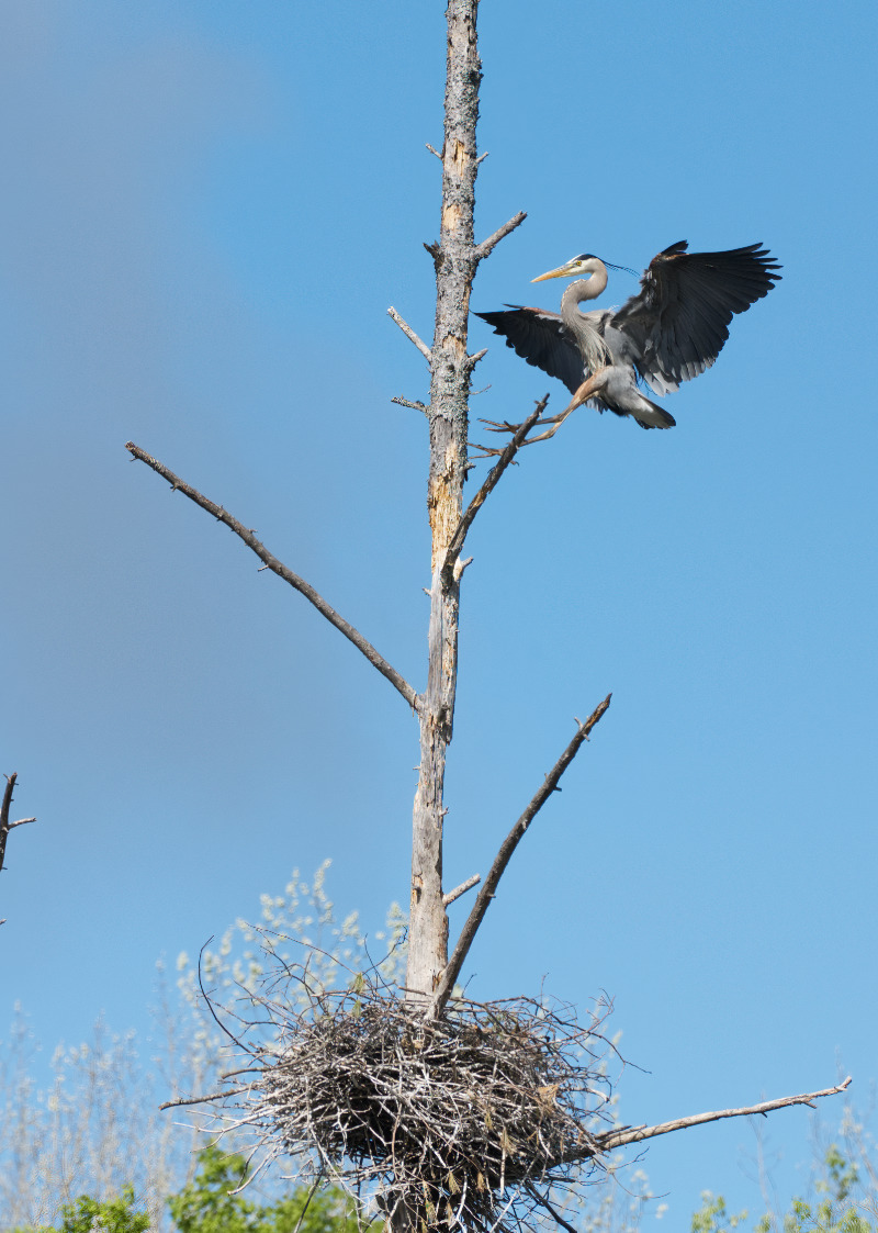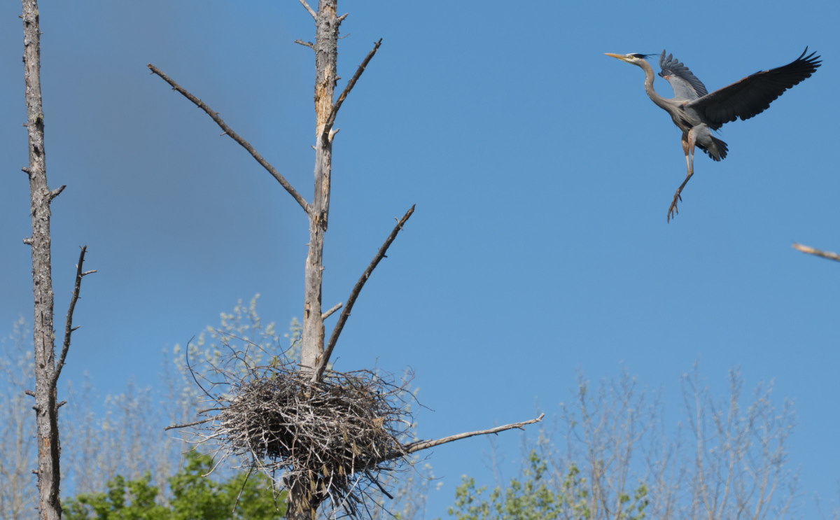 The male purple finch decides to visit the heron nest