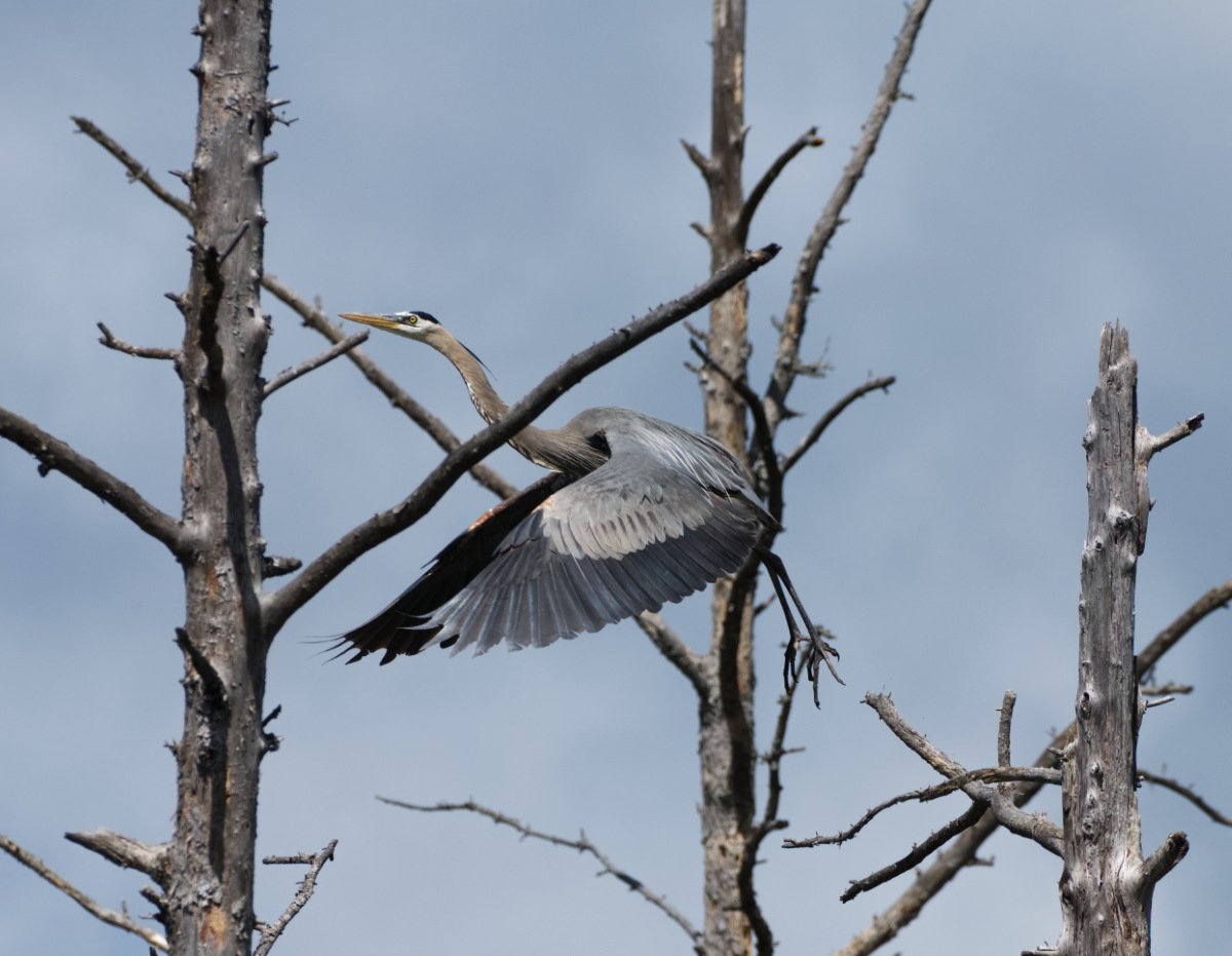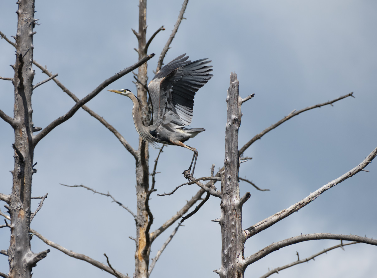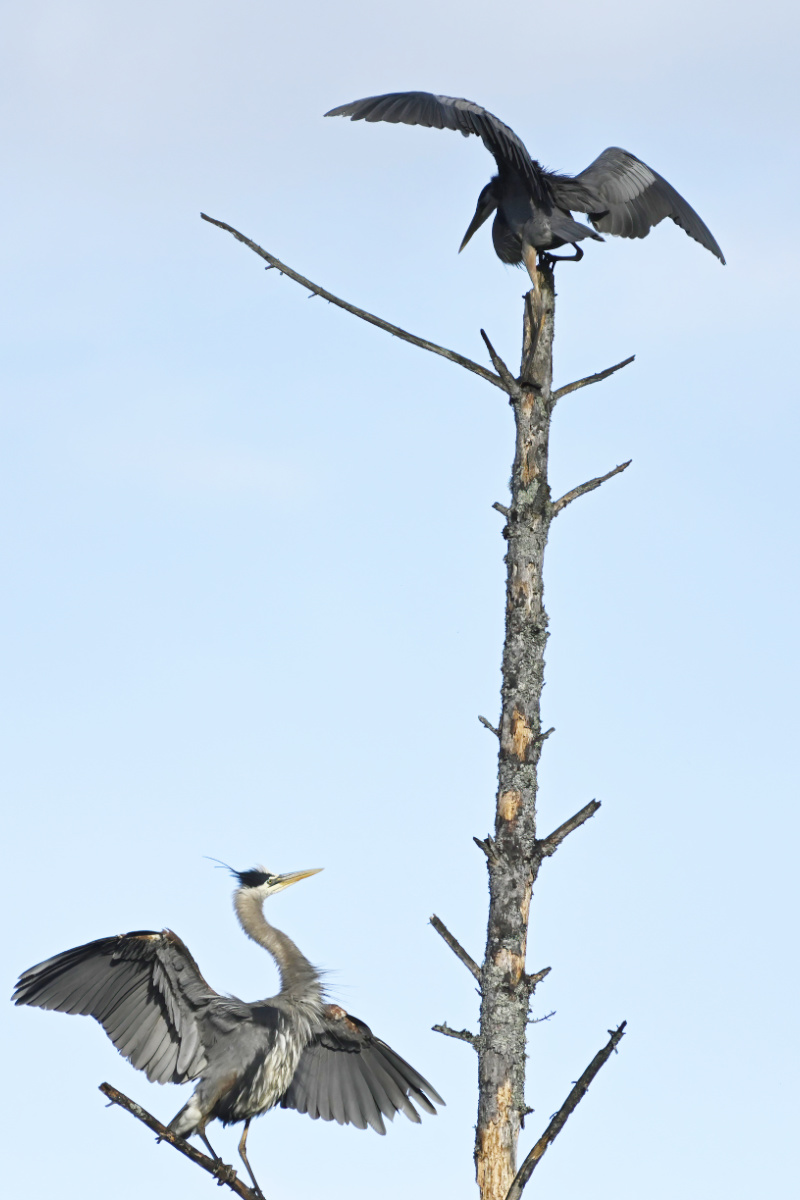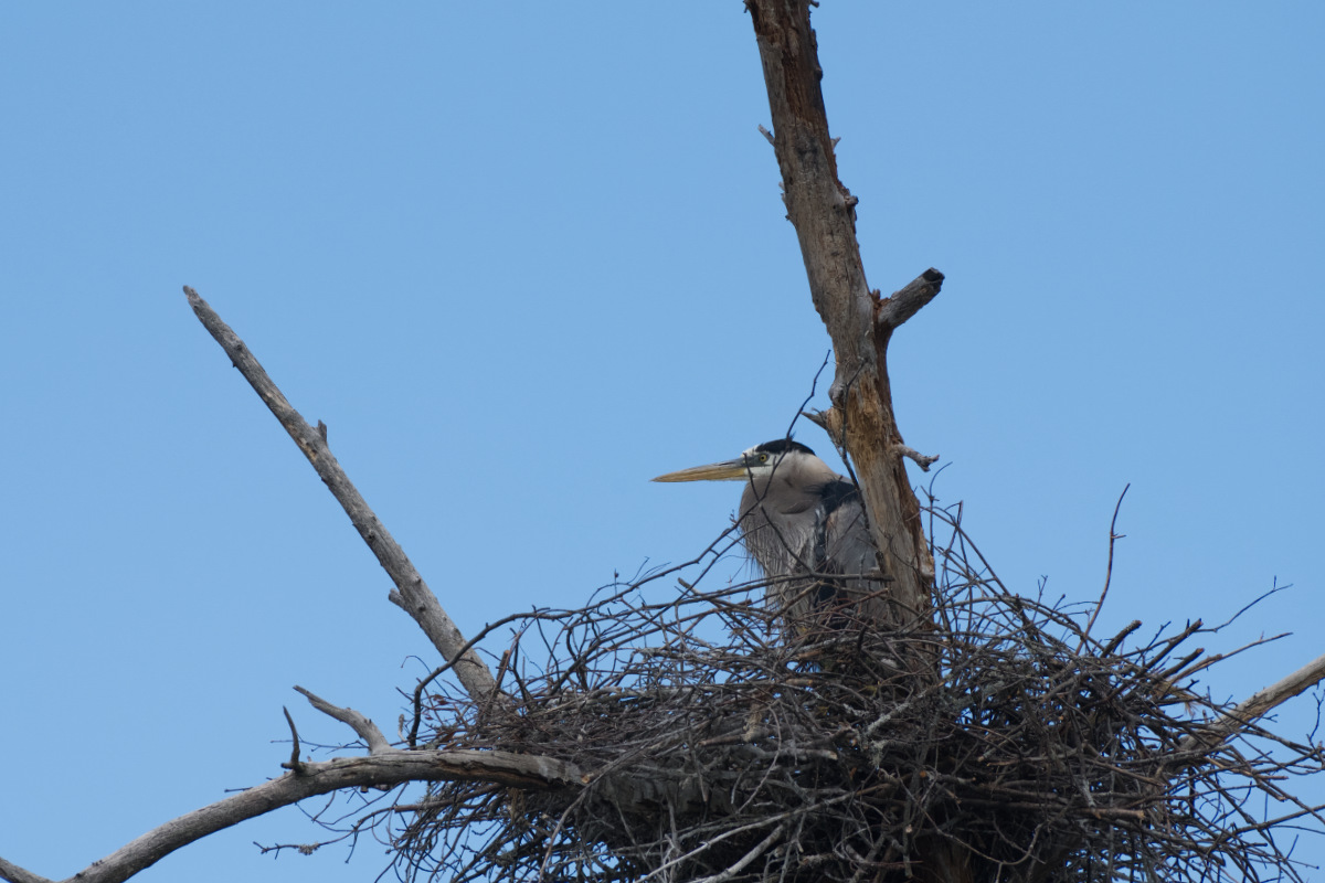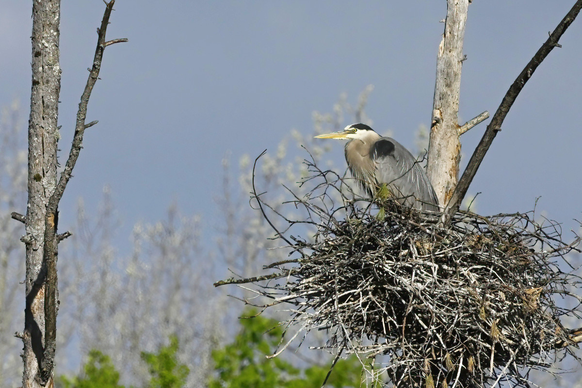 The male purple finch decides to visit the heron nest